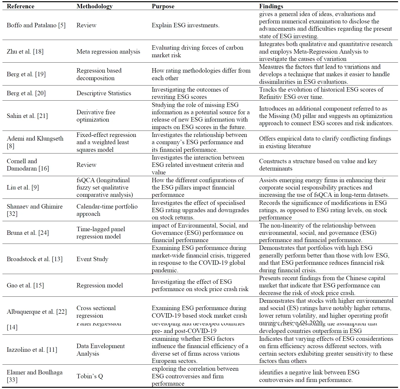 15] examine how corporate ESG performance affects stock price crash risk. It finds that higher ESG performance correlates with reduced crash likelihood, a result confirmed through various robustness tests. ESG performance mitigates crash risk by attracting green investors, enhancing analyst competence, and guiding management behaviour.