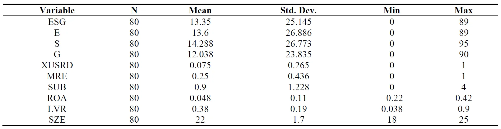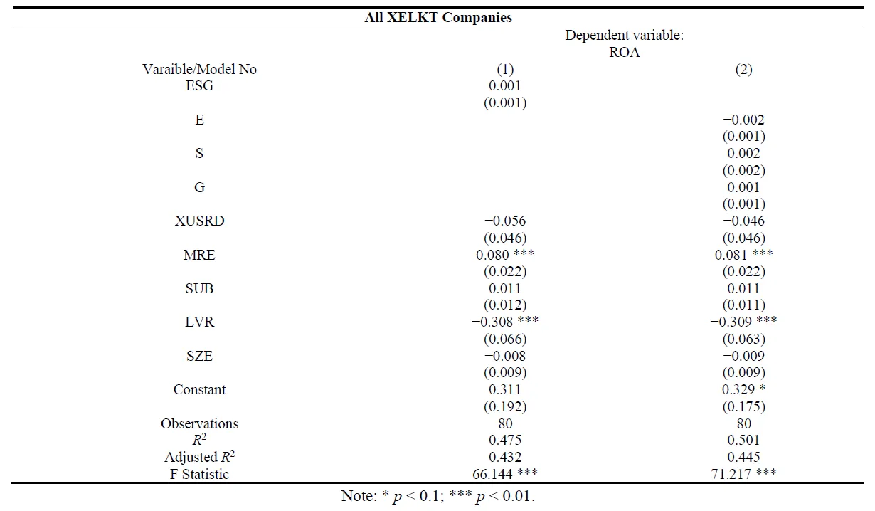 Through the dataset, it can be noted that the size of the companies in XELKT is quite similar when standard deviation is taken into consideration. Similarly, the same argument can be said for leverage ratio as well. Since there are only 9 companies that have ESG scores amongst 20, the mean of ESG, E, S and G scores are relatively low. GWIND-2022 has the greatest ROA in the dataset while AKSUE-2019 has the lowest. AKENR-2021 has the highest “E” pillar score, while ENJSA-2022 and ENJSA-2021 have the highest “S” and “G” pillar scores, respectively. ENJSA-2022 also has the highest overall ESG score as well.