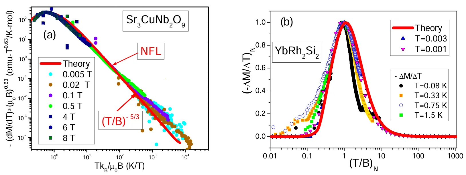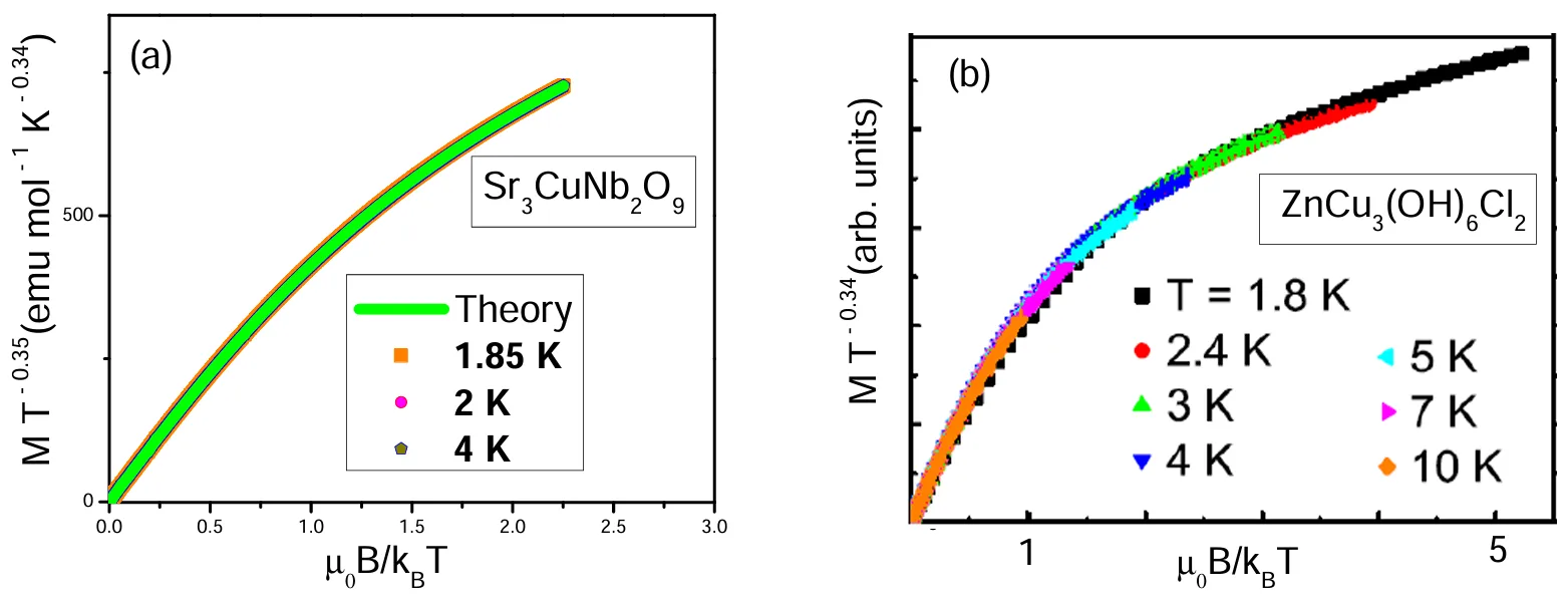 Thus, it follows from Equation (9) that $$M \left( B , T \right) T^{- 1 / 3}$$ depends on the only variable $$y \propto \mu_{0} B / k_{B} T$$. These observations are in good agreement with the scaling behavior of $$M T^{- 0 . 35}$$ and $$\chi \propto T^{- 0 . 63}$$ experimentally established in Ref. [