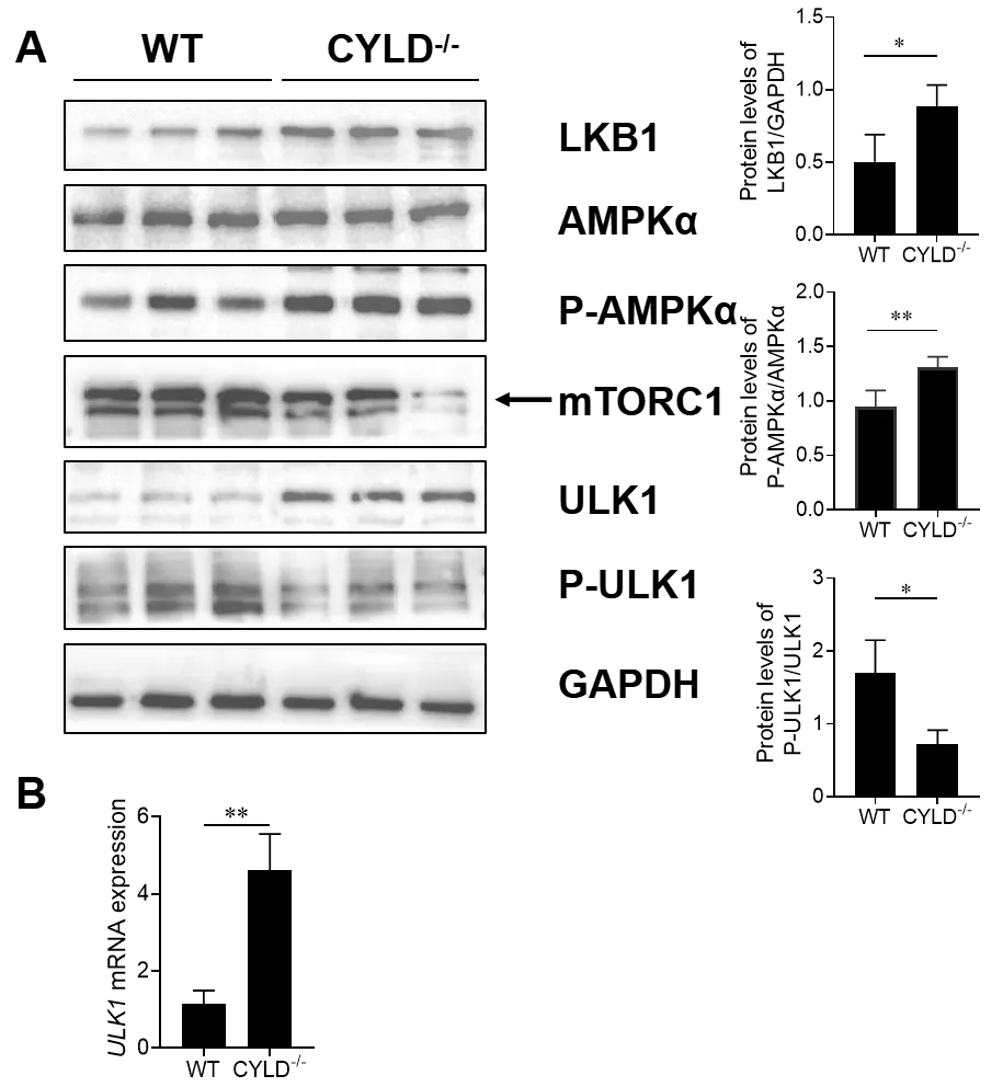 22], and mitochondria are the energy center of cells. Studies have shown that AMPKα can enhance mitochondrial energy metabolism and improve mitochondrial function by regulating the number of mitochondria and increasing enzyme activity in mitochondria, while mitochondrial dysfunction leads to metabolic disorders. While, whether CYLD regulates the pathway of autophagy and affects cell metabolism through the AMPKα signaling pathway is still unknown.