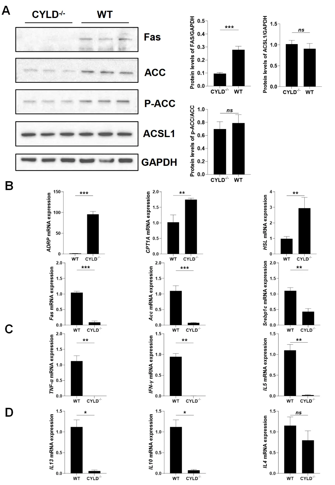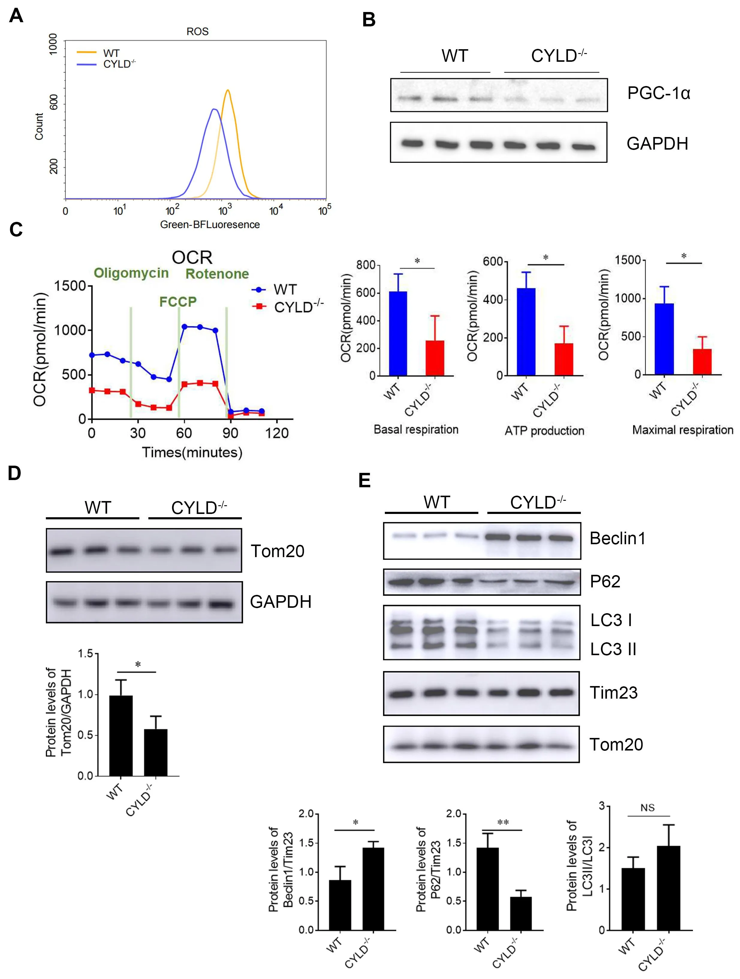 g for 15 min at 4 ℃. Proteins were separated by 8–15% sodium dodecyl sulfate polyacrylamide gel electrophoresis and blotted onto a polyvinylidene difluoride membrane (PVDF) (Millipore, Burlington, MA, USA) following blocking with 5% nonfat dry milk in tris buffered saline (TBS) with 0.05% Tween 20 (TBST) at room temperature for 2 h and then incubated with the primary antibodies (dilution, 1:2000) overnight at 4 °C. Then the PVDF membranes were washed three times for 6 min in TBST on the shaker. After washing, the membranes were incubated with horseradish peroxidase (HRP)-conjugated secondary antibodies (dilution, 1:3000) at room temperature for 1 h and the PVDF membranes were then washed three times for 6 min in TBST. Mitochondrial proteins were extracted according to the manufacturer’s protocol (Beyotime). Following antibodies (Abs) were used in this study: CYLD (#CST-8462), LC3 (#CST 3868), Beclin 1 (#CST 3495), AMPKα (#Proteintech-10929-2-AP), phosphor-AMPKα (P-AMPKα; #CST-2535), total mammalian target of rapamycin (mTOR; #CST 2983), phospho mTOR (P-mTOR; #CST 5536), Unc 51 like autophagy activating kinase 1 (ULK1; #Proteintech-66536), phospho ULK1 (P-ULK1; #CST 5869), PGC-1α (#CST 2178), Phospho-Acetyl-CoA Carboxylase (Ser79) (P-ACC; #CST D7D11), Acetyl-CoA Carboxylase (ACC; #CST C83B10), Fatty Acid Synthase (FAS; #CST-C20G5), GAPDH (#ab-9485), and anti rabbit IgG (#CST 2385) (Cell Signaling Technology, MA, USA).