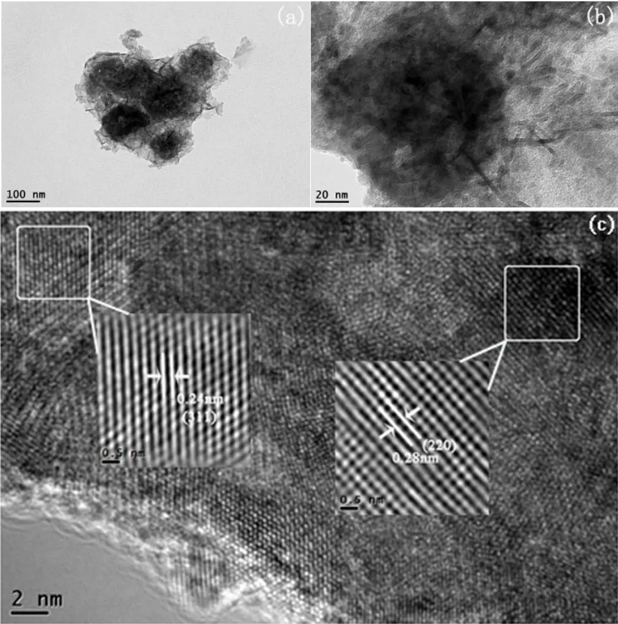 . (a,b) TEM image of the Co3O4 depositing layer; (c) HRTEM image of the Co3O4 depositing layer.