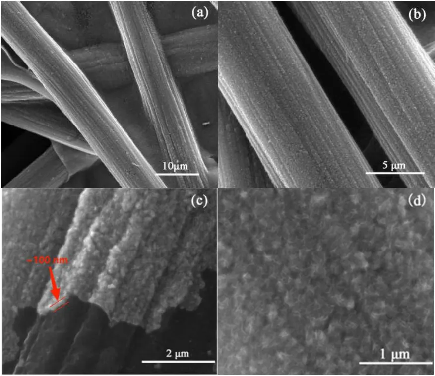 4 was evenly deposited on the surface of the CP fiber, with a thickness of around 100 nm and direct attachment to the fiber surface. d is a partial enlargement of the Co