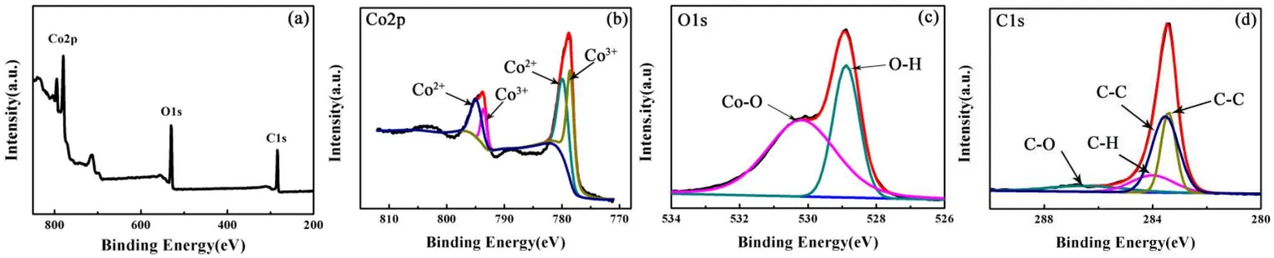 . XPS of Co3O4@CP composite. (a) Survey scan. (b) Co2p spectrum. (c) O1s spectrum. (d) C1s spectrum.