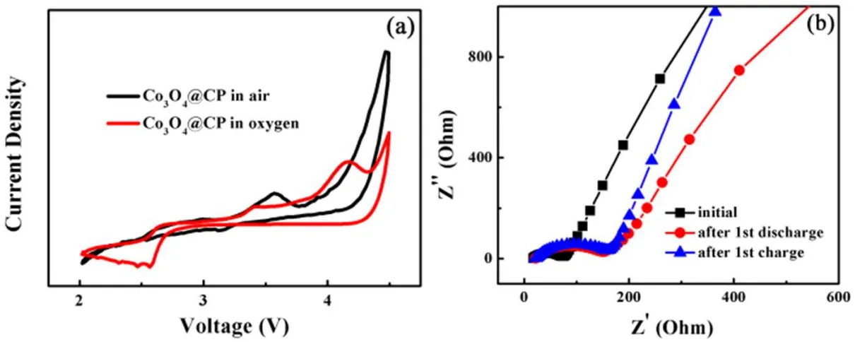 The Co3O4@CP composite and lithium foil were as the cathode and anode of the lithium oxygen battery, respectively. The diameters of the Co3O4@CP cathode and lithium foil were separately controlled at 14 mm and 15 mm. A piece of Whatman GF/D (Metersbonwe, UK) glass microfiber filter paper was used as the separator between cathode and anode aiming to avert short circuit, and 1.0 M lithium bis(trifluoromethanesulfonyl)imide (LiTFSI) in tetraethylene glycol dimethyl ether as the electrolyte. The whole process of assembling cell was performed in glove box system filled with argon, and the battery was placed in the glove box for more than 12 h. The cells after aging were purged with tetraglyme-saturated oxygen for 2 h before electrochemical tests.