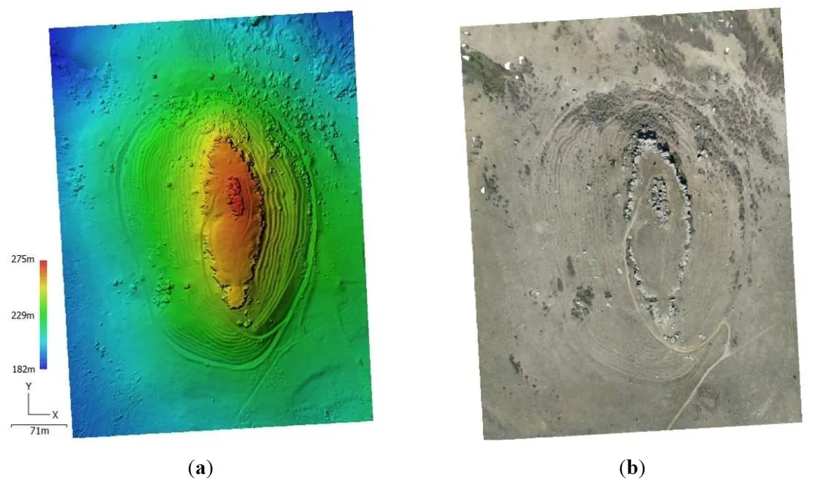 . (<b>a</b>) DSM and (<b>b</b>) orthophotomosaic (center of figures: 41°0′52.45″N 22°42′29.59″E).