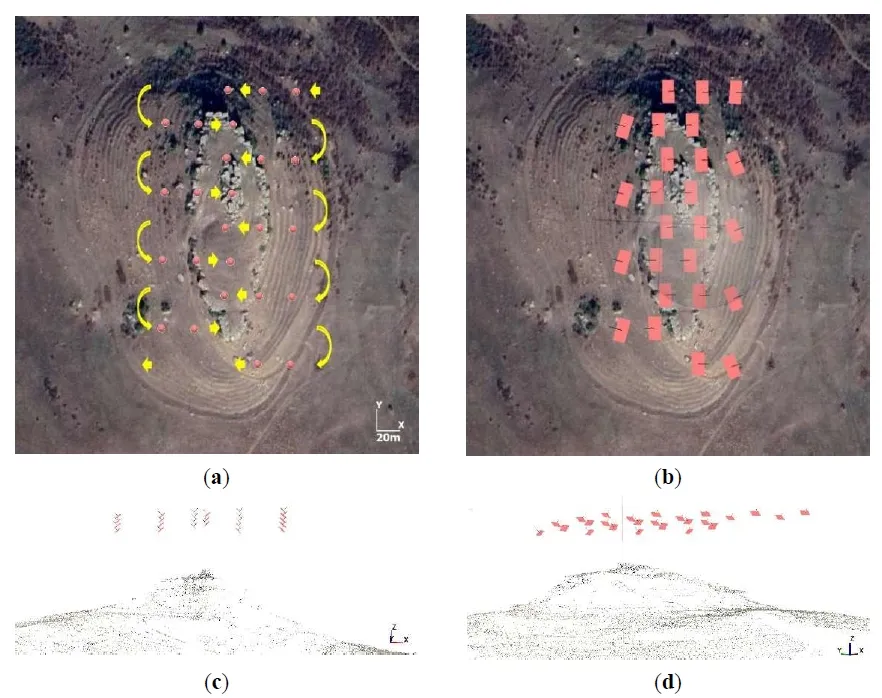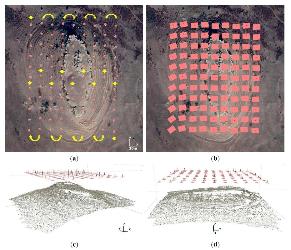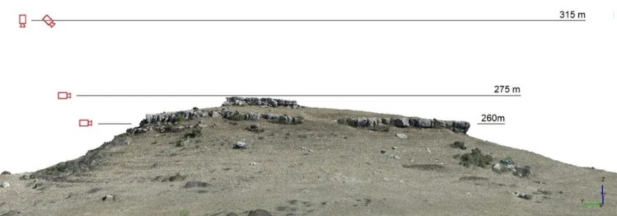 A vertical collection of images would not allow a complete mapping of the hill, as the bedrock also creates surfaces that either develop vertically or are indented. Therefore, an additional collection of inclined and horizontal images were required ().