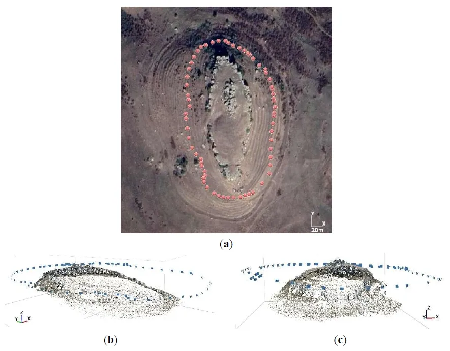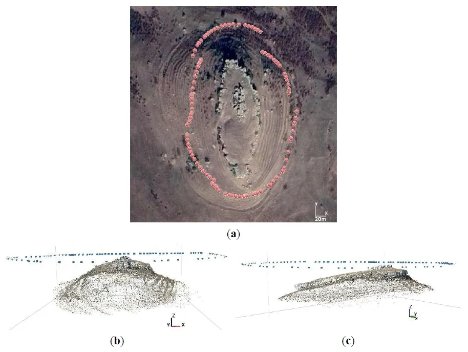 . Second horizontal image collection flight; (<b>a</b>) the positions of the acquisition points (Map Data: Google Maps, image ©2024 Airbus, Maxar Technologies, Center of figure: 41°0′52.45″ N 22°42′29.59″ E) and; the 3D perspectives of the collected images; (<b>b</b>) from the southwest and (<b>c</b>) from the south.