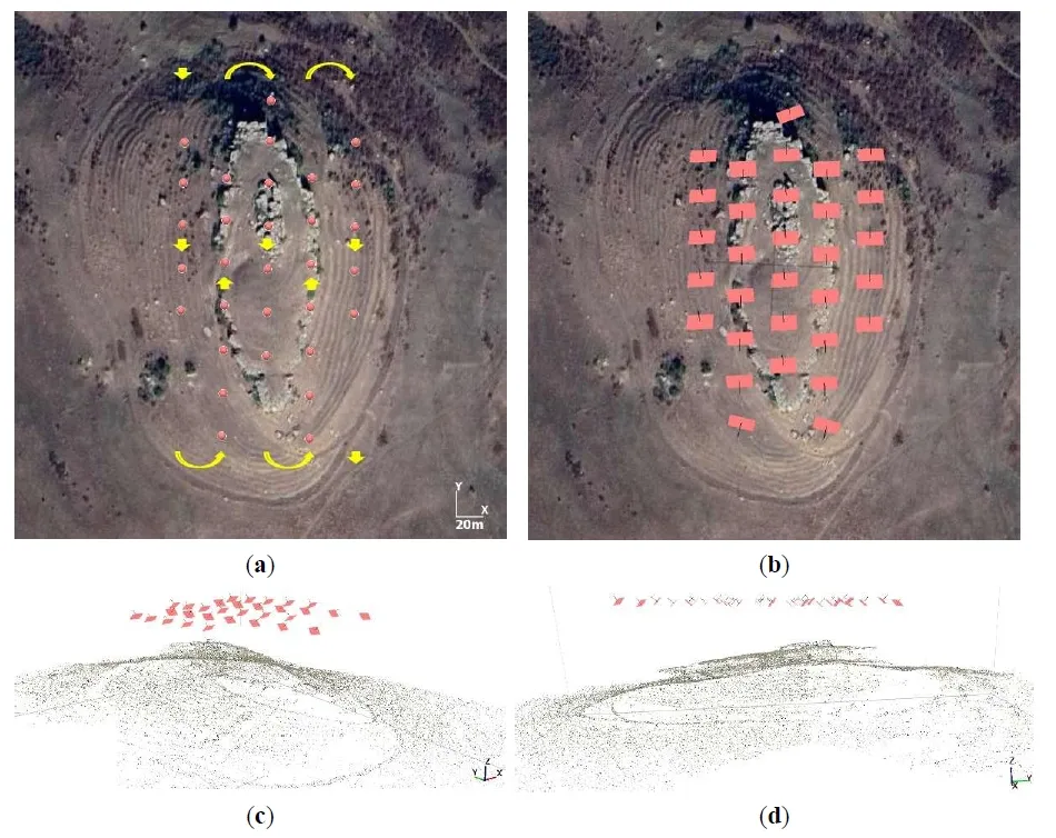 . (<b>a</b>) Flight diagram with the positions of the capture points (Maps Data: Google Maps, image ©2024 Airbus, Maxar Technologies, Center of figure: 41°0′52.45″ N 22°42′29.59″ E). Start of image captures from the southeastern corner with a flight direction from south to north; (<b>b</b>) the layout of the vertical images and; the 3D perspectives of the collected images (<b>c</b>) from the southwest and (<b>d</b>) from the east.
