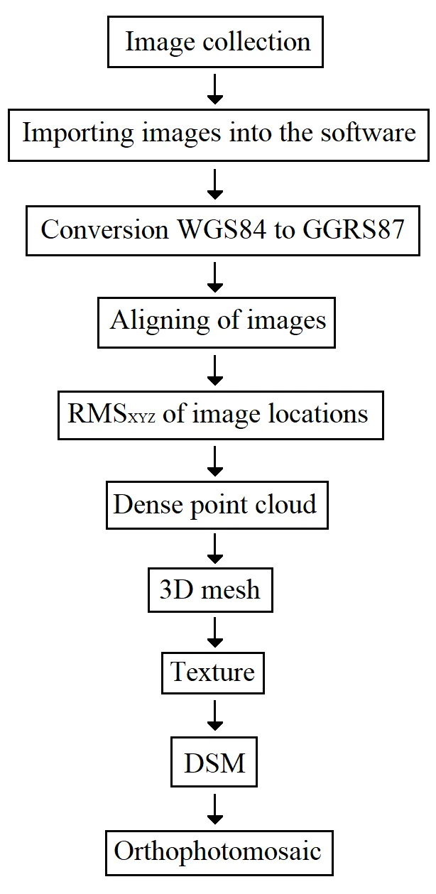 In this paper, Ground Control Points (GCPs) were not measured in the field or used during digital image processing to produce DSM and orthophotomosaic. This will be carried out in the next stage of the study (GCPs measurements, not new image acquisitions as follows), ultimately producing the above products with high spatial accuracy [