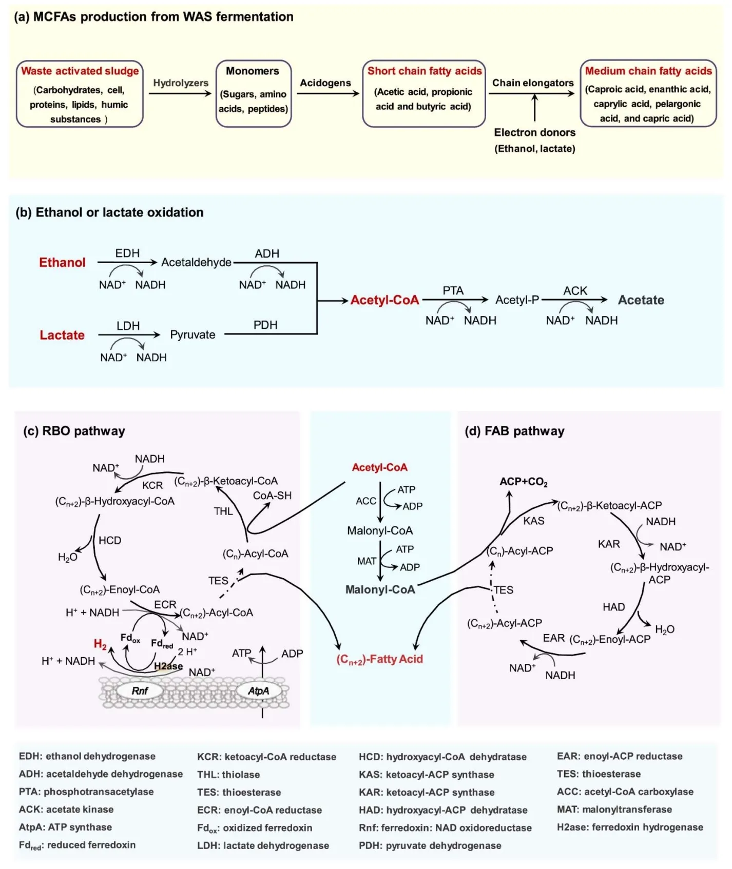 Chain elongation refers to the process in which VFA and additional high-energy reducing substances (such as ethanol and lactate) are used as electron acceptors and electron donors, respectively, to synthesize medium-chain fatty acids. At present, two chain elongation pathways for producing MCFA have been reported, namely, reverse β-oxidation (RBO) (c) and fatty acid biosynthesis (FAB) (d). The FAB pathway is a frequently occurring process in the majority of microorganisms, which generates fatty acids for various cellular purposes, such as serving as biological scaffolding, being incorporated into cell membranes, and for the synthesis of biotin [