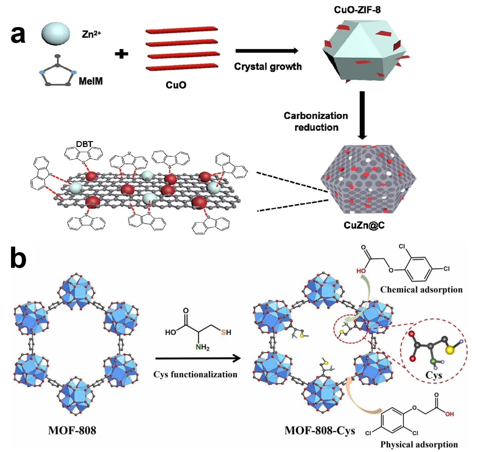 . (<b>a</b>) Mechanism of Cu, Zn-embedded MOF-derived bimetallic porous carbon for adsorption desulfurization [