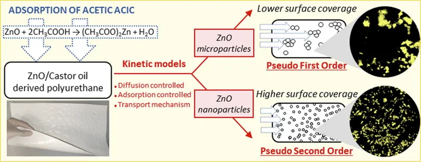 In addition, novel nanomaterials have attracted extensive attention in the field of adsorption due to their unique nanoscale effects and surface properties. ZnO nanoparticles can be used for adsorbing VFAs due to their relatively high adsorption capacity, fast adsorption rate and abundant surface functional groups. Acetic acid engages with castor oil polyurethane and permeates to the surface of ZnO particles, where it crystallizes as zinc acetate. This facilitates the transport of acid to the surface of zinc oxide, so producing a synergistic action [
