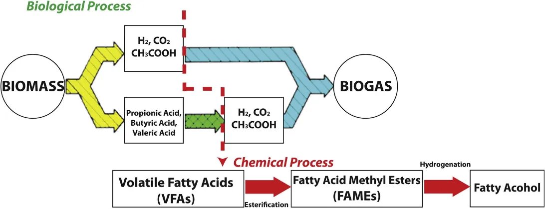 The conversion pathway of high-value VFAs can be accomplished through biological methods, specifically utilizing cells, microorganisms, and enzymes for the conversion process. The biological conversion of VFAs exhibits high selectivity, rapid processing and is comparatively eco-friendly. However, it does not have the economy of the chemical method. The parameters for chemical conversion are comparatively flexible in contrast to those for biological conversion, and the chemical reagents exhibit greater stability, making them more appropriate for large-scale production.