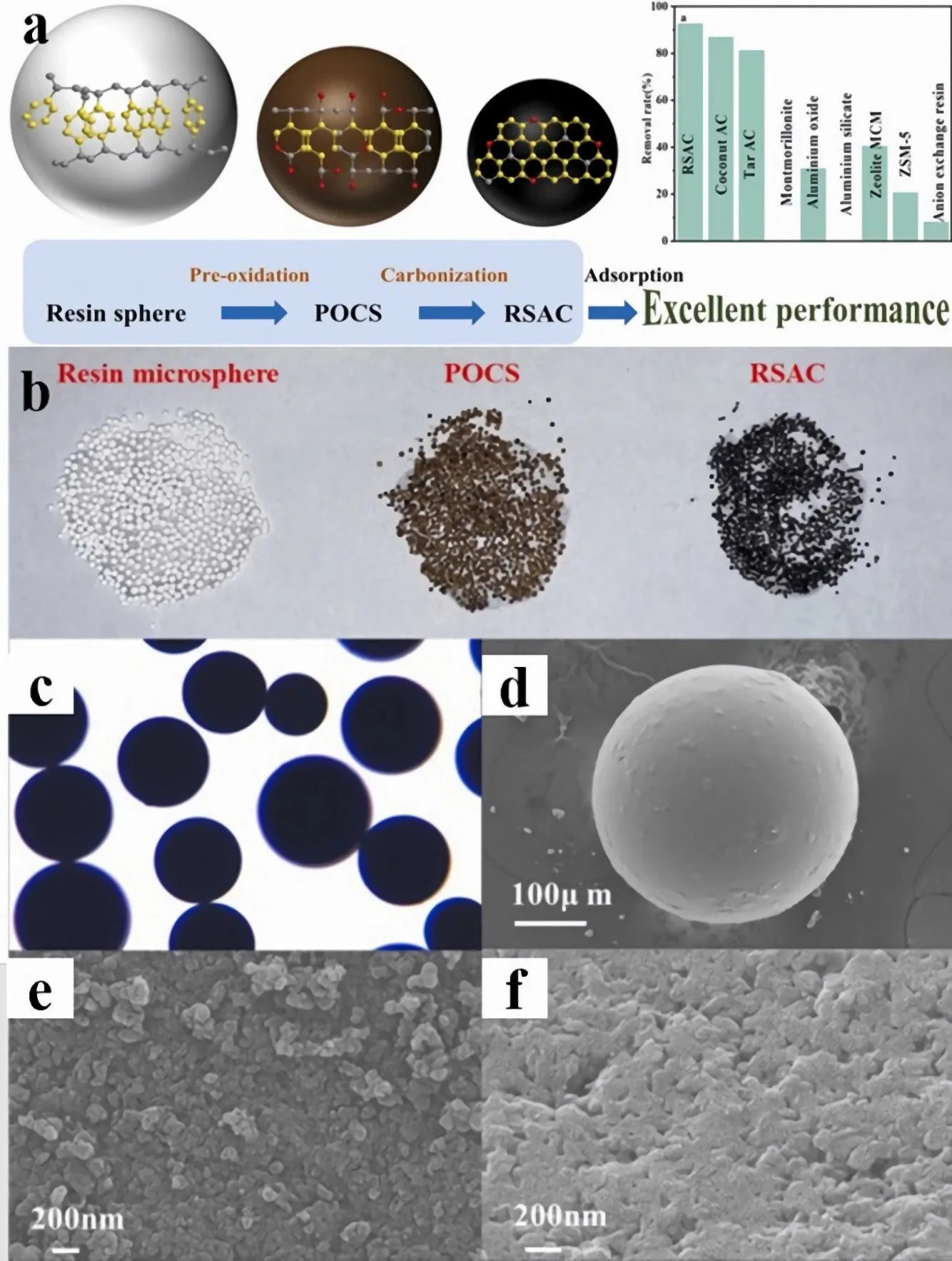 31]. Sun et al. directly prepared resin-based spherical activated carbon through a simple pre-oxidation and carbonization process, which solved the problems of low mechanical strength, easy loss, and high production cost (due to the need for further physical or chemical activation) of traditional powder and granular activated carbon, and further used waste resin microspheres to prepare spherical activated carbon to adsorb acetic acid, realizing a benign scheme of “treating waste with waste” [