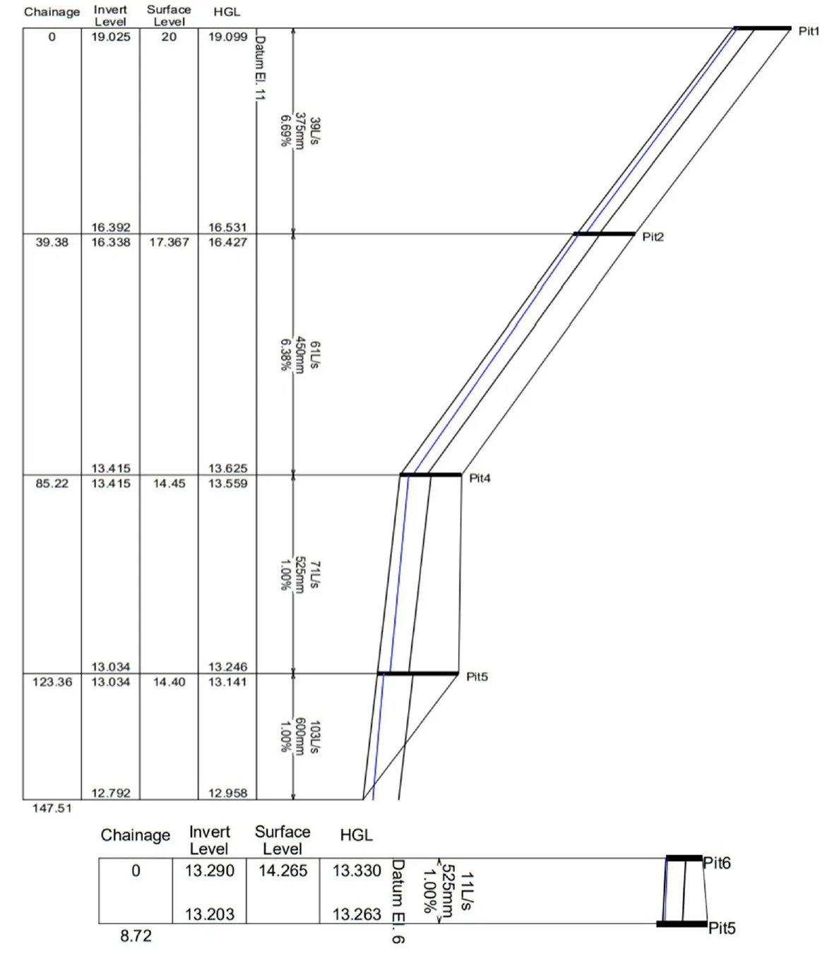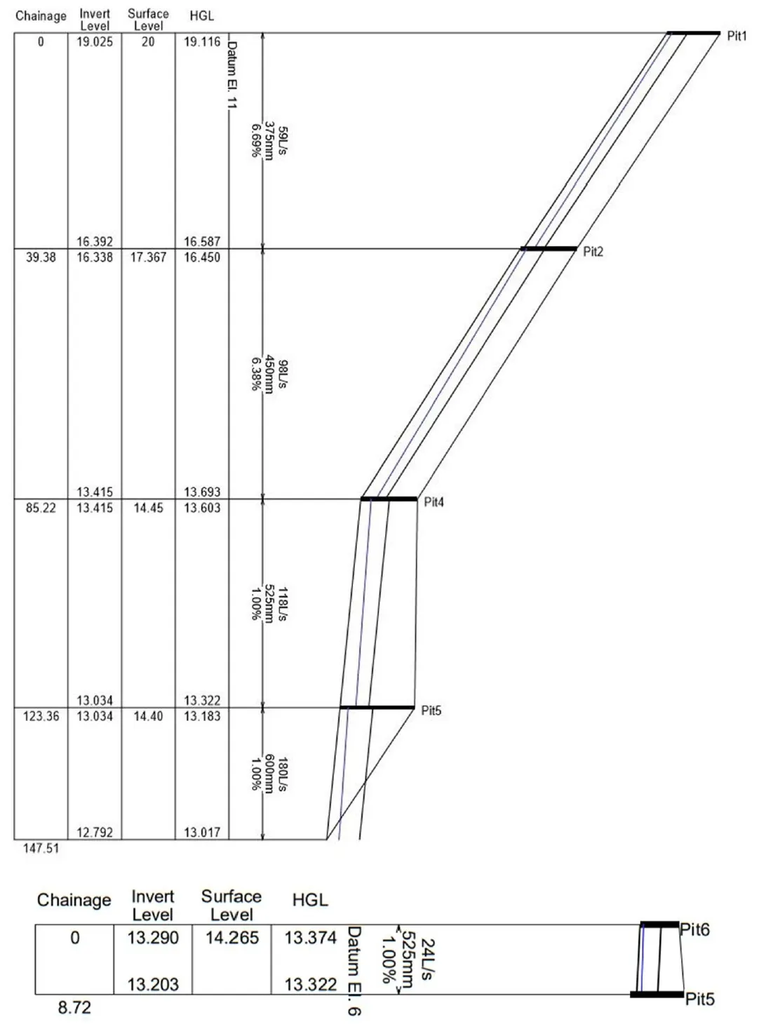 etc., for a drainage network using a CAD file. Hydrological, rainfall data, and ctachment data are required to be input in the model. Thereafter, the model is required to run under major and minor rainfall events. The model then gives an idea whether there is any probability of flooding of the catchment; few trials and errors in terms of drawing and data input are needed to get the optimum results from the model. This model can also draw a long section showing the hydraulic grade line, pipe size, slope, invert level of pipe