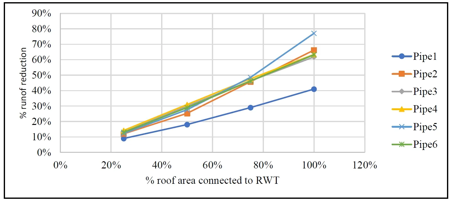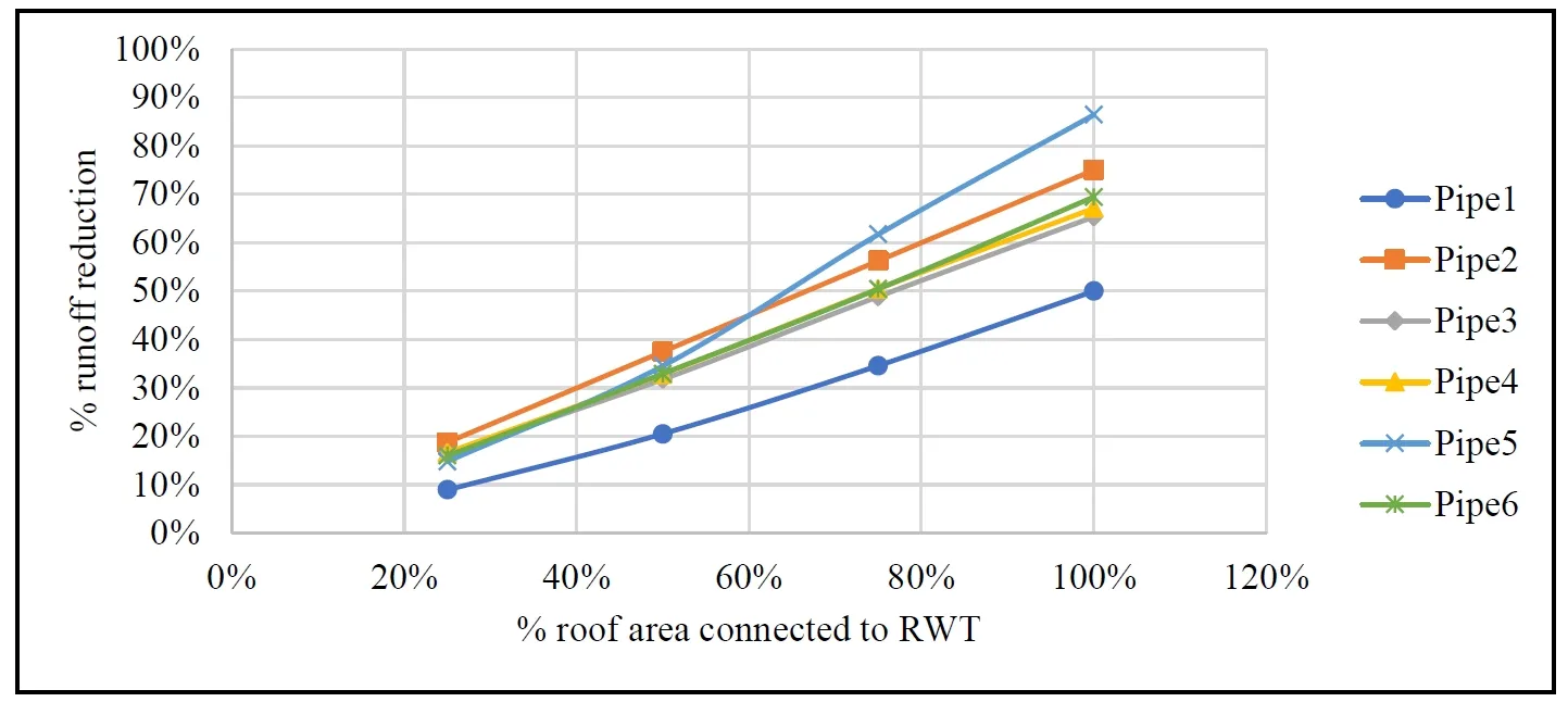 17] reported RWTs to be particularly effective in runoff reduction, showing a maximum reduction of 48.1% after modelling a rural residential development in Western Australia. Similarly, research conducted in South Korea found a reduction from 42 to 32 tons for a storm of 0.8 cumulative probability after testing a new model for RWH that included the use of an RWT [