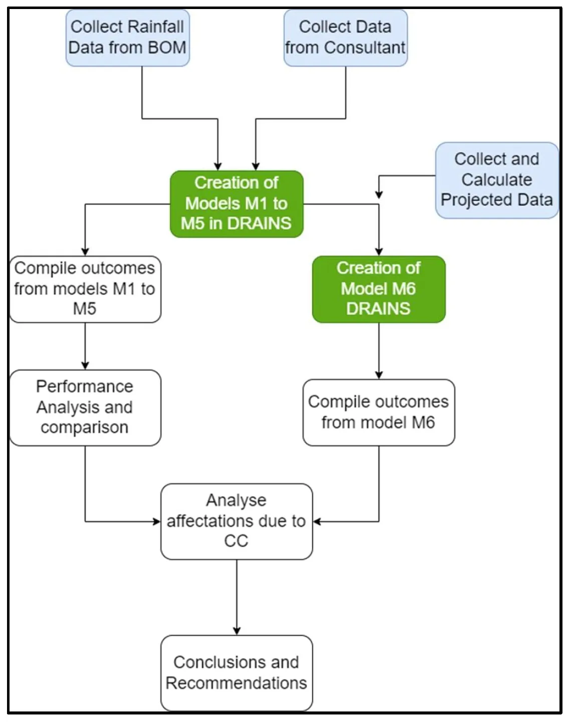. Flowchart of research methodology (BOM = Bureau of Meteorology, CC = Climate Change and M1–M6 = Models of different scenarios).