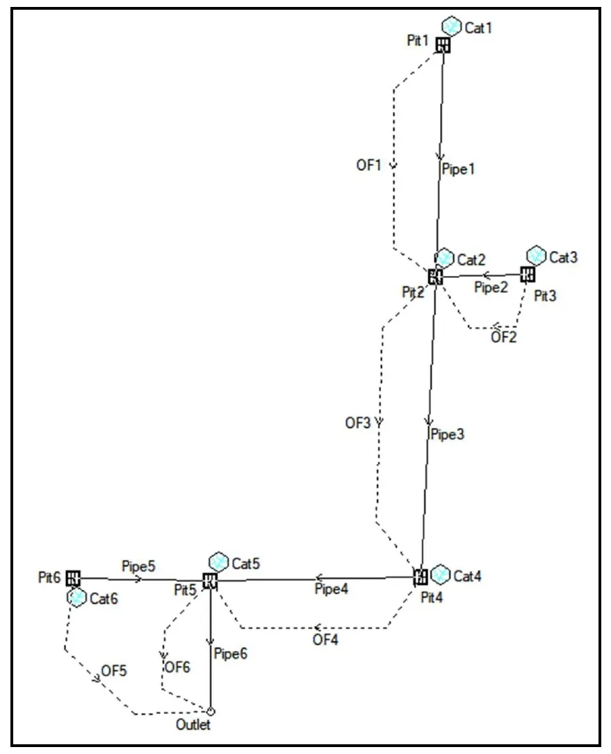 i.e., without RWTs) for a SDS. The layout of a drainage network in DRAINS includes elements such as sub-catchments, pits, pipes, and overflow routes. illustrates the layout defined for this study. Each one of these elements requires a specific set of parameters, obtained according to the site characteristics and the SDS.
