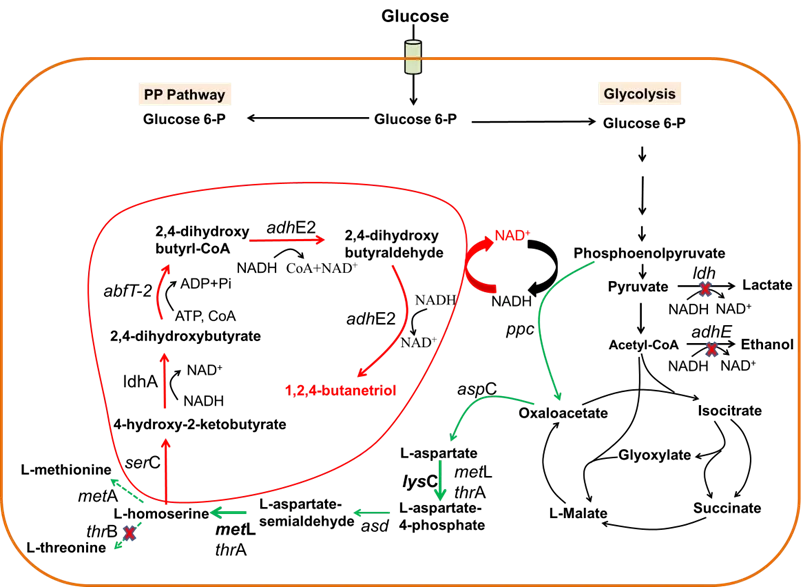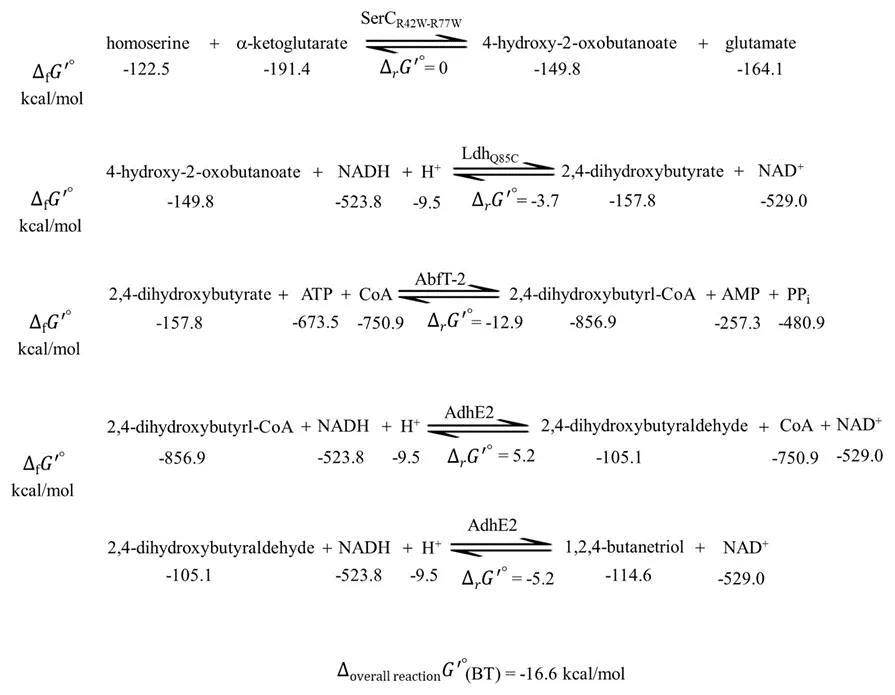 17], making homoserine an appealing precursor for the biosynthesis of BT. The non-natural 4-hydroxy-2-oxobutanoic acid (HOBA), which is from the deamination of homoserine, differs from BT by only one terminal carboxyl group and one carbonyl group. Hence the conversion of HOBA to BT requires reduction of these two functional groups to hydroxy groups. The carbonyl group of HOBA can be reduced to a hydroxy group by lactate dehydrogenase A (LdhA) from *Lactococcus lactis* by structure-based enzyme engineering [