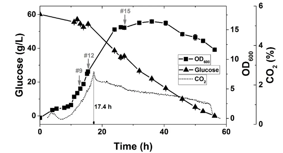 600 reached 10 during aerobic phase, 0.2 mM IPTG was added in the culture. After 1 h post-induction, the airflow rate was set to 0.02 vvm for microaerobic conditions, and 10 mM NaHCO
