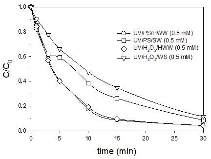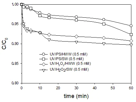 2 system, both after 15 min of irradiation. For the same reaction time within the synthetic seawater, 73.7% and 65.2% removals were achieved with the UV/PS and the UV/H