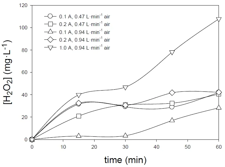 In order to know the effect of the applied current on the electro-Fenton degradation of the two drugs, different experiments were made. After choosing the airflow that gave the maximum hydrogen peroxide production (0.944 L·min