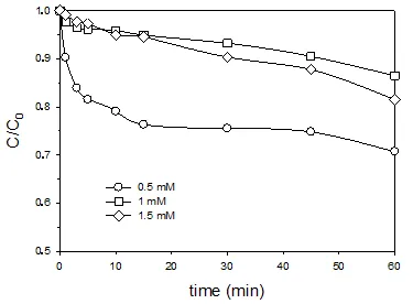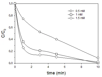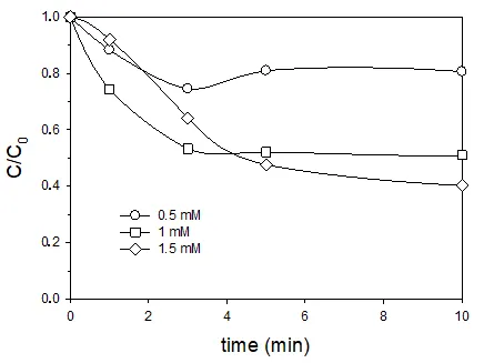 2 (1.5 mM) gave a 59.7% drug removal after 10 min and under the same radiation intensity, while the observed degradations were lower when using 0.5 mM and 1.0 mM initial concentrations of H