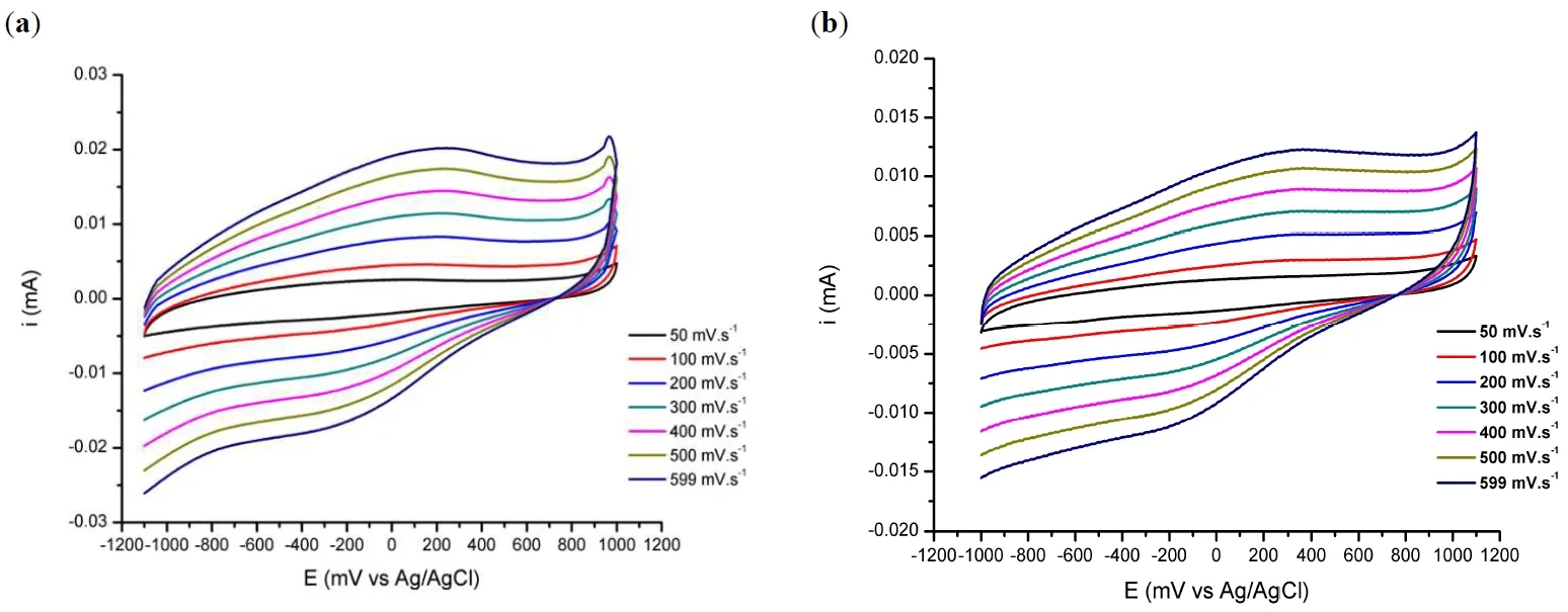 vs. the square of the scan rate plot provided the typical straight line corresponding to a diffusion controlled process. The voltammograms shapes, and the values of their anodic and cathodic peak potentials show independence from the scan rates and a close to 1 anodic to cathodic current peak relation. Those two facts indicate a quasi-reversible electrochemical behavior of the two systems [