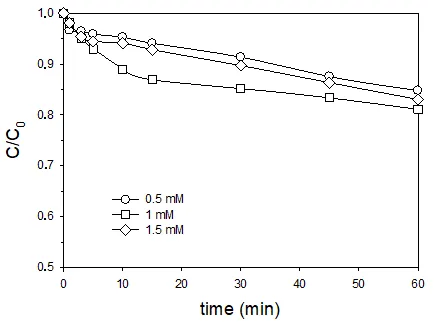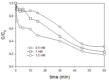 shows the time course of degradation of MET when solutions of three different concentrations of PS were used in homogenous photocatalytic processes at 254 nm. As can be seen, the advanced oxidation process was effective for the removal of the compound (around 30% degradation with an initial 0.5 mM PS concentration and after 60 min of reaction). However, for larger PS concentrations (up to 1.5 mM) the efficiency decreased, indicating that the excess reagent could scavenge the generated radical species responsible for the direct reaction with the drug.