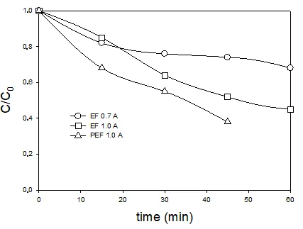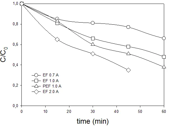 i.e., a photoelectro-Fenton treatment. As can be seen in the presence of light slightly increases the reaction rate of the electro-Fenton process, thus allowing an alternative reaction pathway for the removal of MET (60 min of treatment rendered almost 60% of MET degradation), although improvement was lower than the one obtained by simple increasing the applied current from 1 to 2 A.
