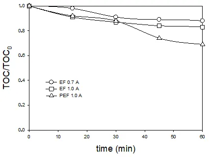 2 with the electro-Fenton treatment. Thus, photoelectron-Fenton process turned out to be noticeably more powerful in terms of organic material mineralization than the corresponding electro-Fenton process.