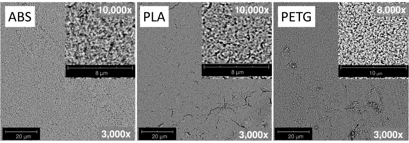 Concerning the manufacturing process of the samples, and based on our own experience, PETG is the most challenging material in terms of printability. When melted, PETG has a high viscosity, making it more susceptible to stringing, which can result in surface imperfections. Additionally, the material can adhere to the nozzle during printing, potentially causing clogs and loss of precision. To mitigate these issues, a higher temperature and proper retraction control settings are necessary. On the other hand, ABS is prone to warping, particularly in large or thin-walled parts, due to uneven cooling that creates internal stresses. This often leads to lifted corners or cracks between layers. These problems can largely be resolved by using higher temperatures during printing. In contrast, PLA is much easier to print and does not produce toxic fumes, making it a more user-friendly option.