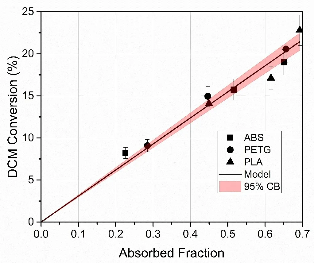 Finally, we analyzed performance aspects, based particularly on the results shown in . Although all three polymers provide similar DCM conversions, PLA seems the best choice for the functionalization of plastics to control airborne organic pollution. However, it must be noted that PETG would be the only viable option if the reactor’s internal configuration requires a semi-transparent support material.