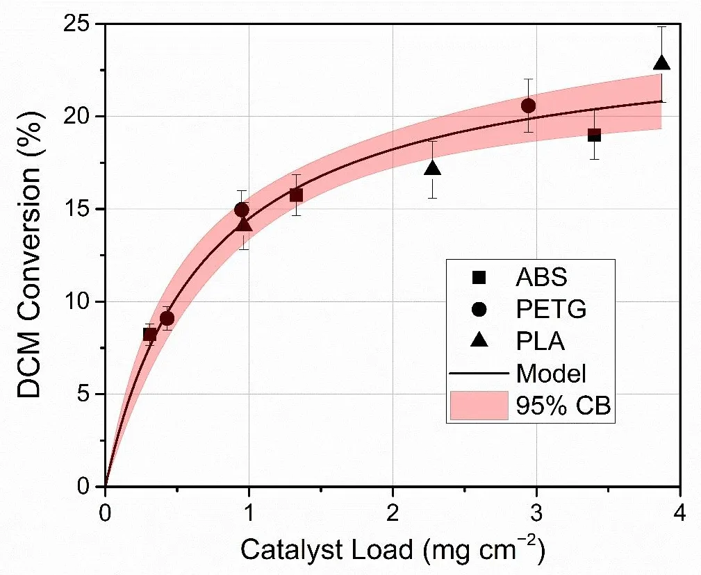 The results in the last column of show a decrease in the DCM concentration per gram of fixed catalyst (ppm/g) of 45.0 (ABS), 38.6 (PETG), and 26.8 (PLA). These values may be contrasted with a previously published study [