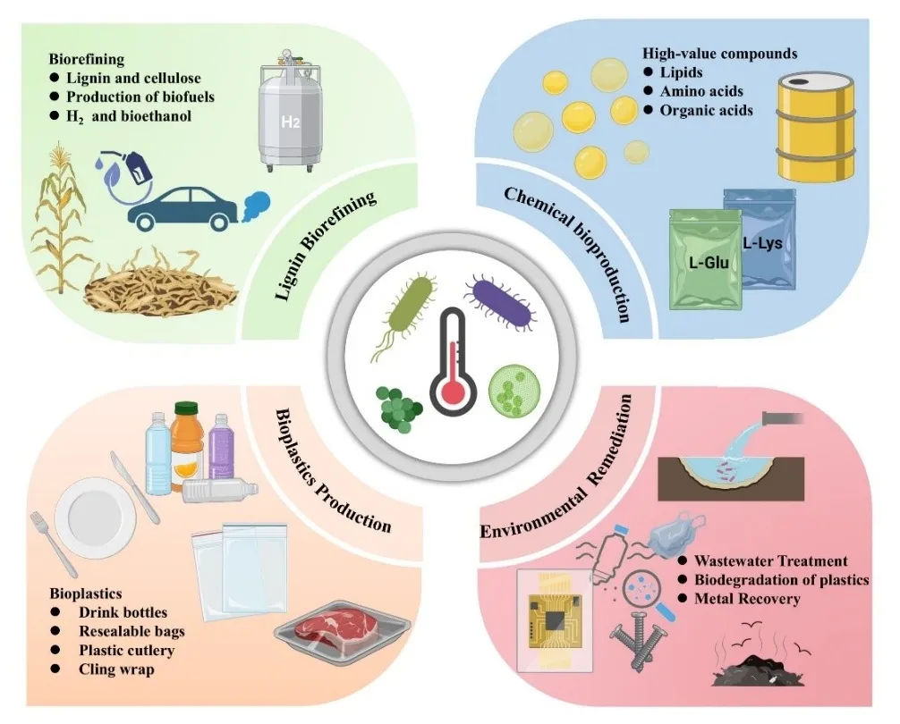 Thermophilic Bacillus B. licheniformis, as an efficient and safe high-temperature fermentation platform strain, grows rapidly at 50 °C. Its strong resistance to chemical denaturants and broad pH adaptability enable the effective production of biofuels, such as D-lactic acid and 2,3-butanediol, in high-temperature environments. Han et al. engineered