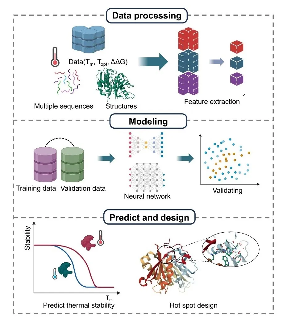 opt to prepare for subsequent analysis. Next, the modeling phase uses neural networks to build a predictive model for enzyme thermostability. Finally, the prediction and design step applies the model to evaluate enzyme performance and optimize critical sites through hotspot design, thereby enhancing enzyme stability under high temperatures.