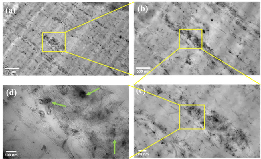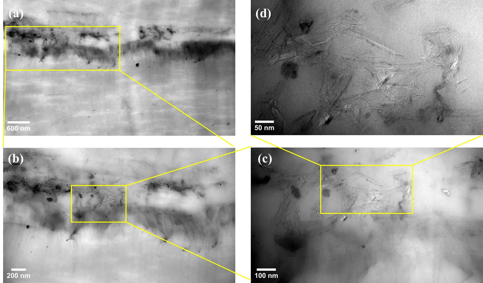 To further investigate the dispersion of CNTs within the NBR matrix, Transmission Electron Microscopy (TEM) was employed to analyse the two groups of nanocomposites. TEM micrographs of the SWCNT nanocomposite reveal distinct regions, with a,b showing significant agglomerations within the NBR matrix, consistent with the SEM analysis in a–d. At higher magnifications (c,d), SWCNTs appear disentangled but still clustered. The small diameter of SWCNTs, typically around 1–2 nm, contributes to their tendency to form clusters due to their high surface area-to-volume ratio, which increases van der Waals forces between individual tubes [