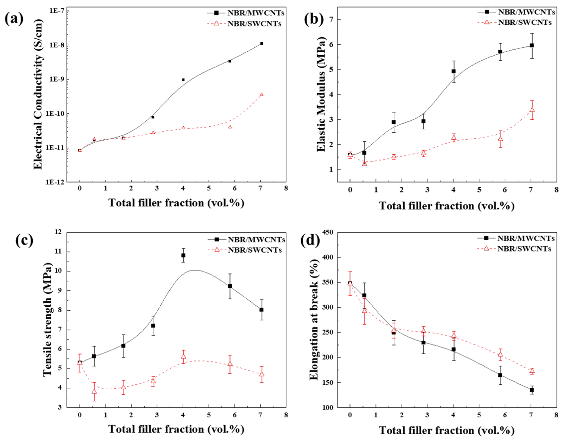 This study aims to fill these research gaps and to advance the body of knowledge surrounding elastomer/CNT nanocomposites, by providing a detailed comparative investigation on the mechanical and electrical properties of two groups of elastomer nanocomposites respectively containing SWCNTs or MWCNTs.