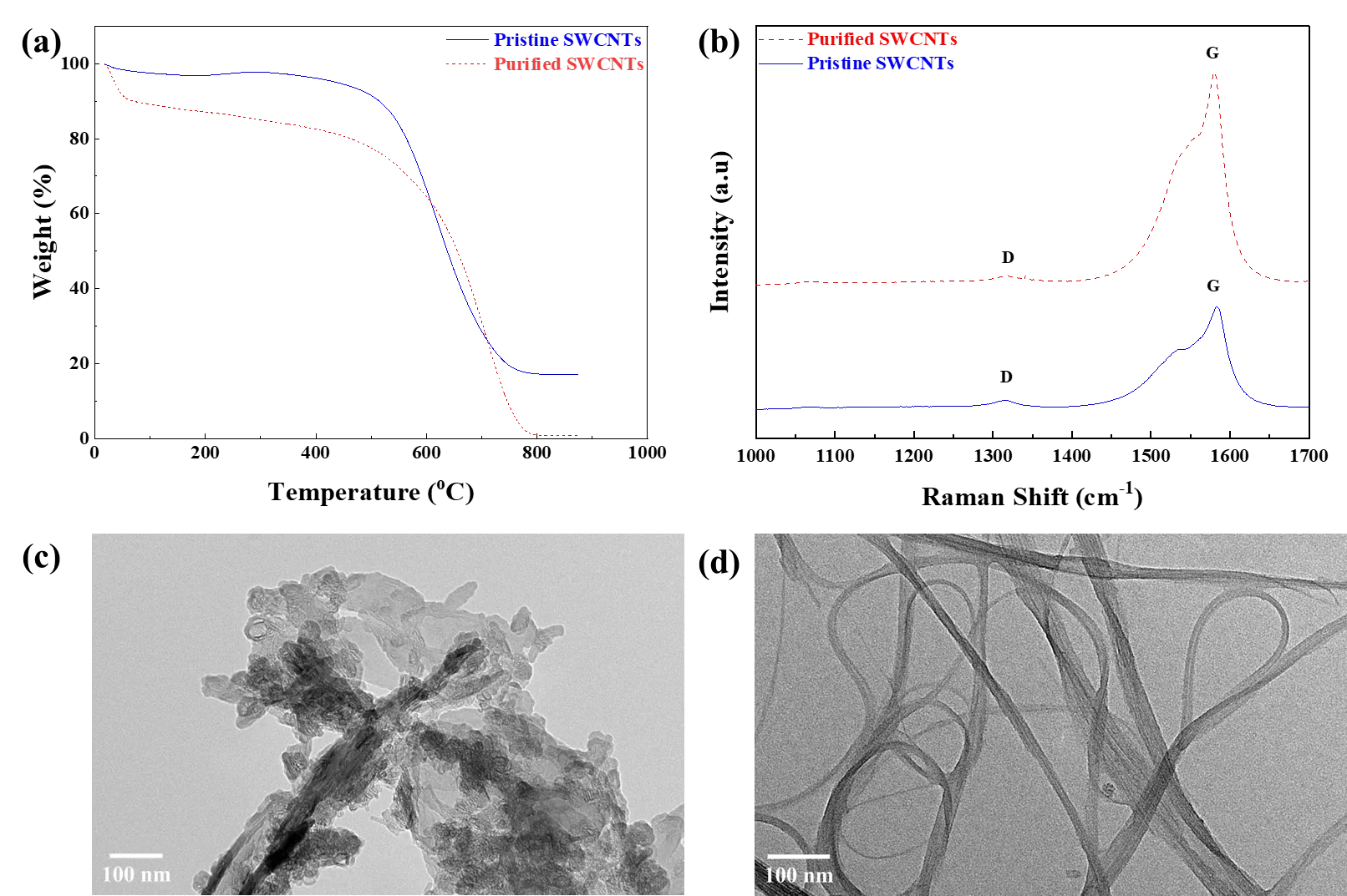 . (<b>a</b>) TGA graphs of pristine and purified SWCNTs. (<b>b</b>) Raman spectra of pristine and purified SWCNTs, showing the D-band (~1320 cm<sup>−1</sup>) associated with structural defects and the G-band (~1590 cm<sup>−1</sup>) representing the in-plane vibration of sp2-bonded carbon. TEM images of pristine (<b>c</b>) and purified (<b>d</b>) SWCNTs.