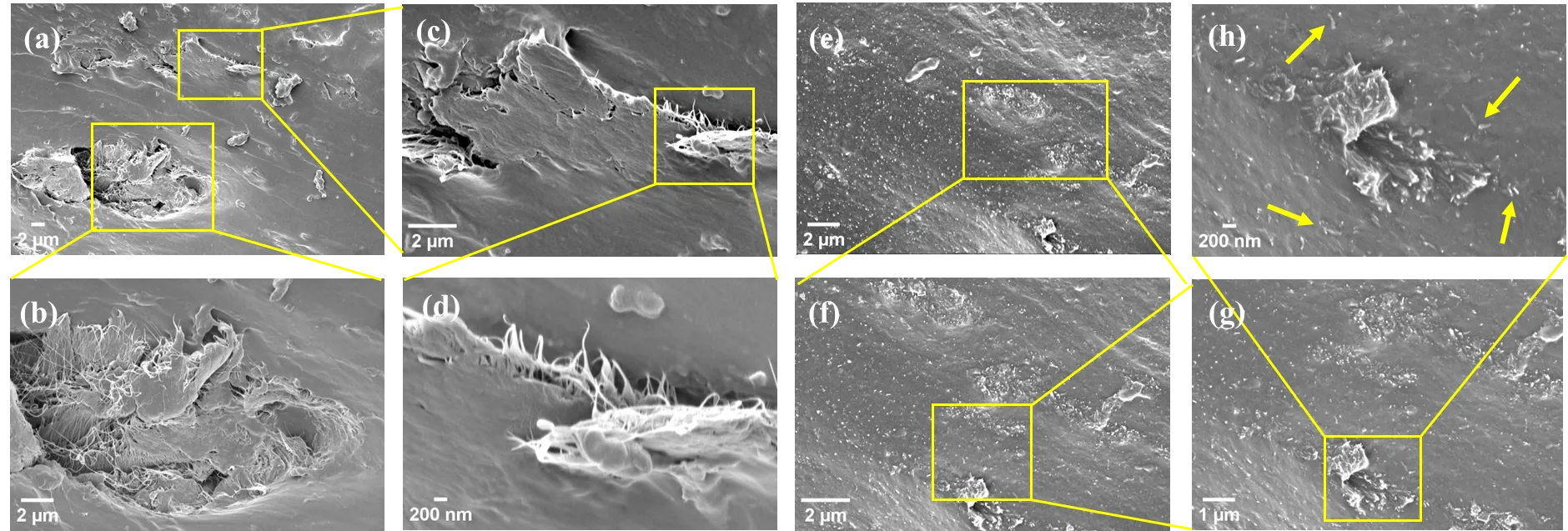 . SEM micrographs of (<b>a</b>–<b>d</b>) NBR/SWCNT nanocomposite and (<b>e</b>–<b>h</b>) NBR/MWCNT nanocomposite, both at 7.05 vol.%.