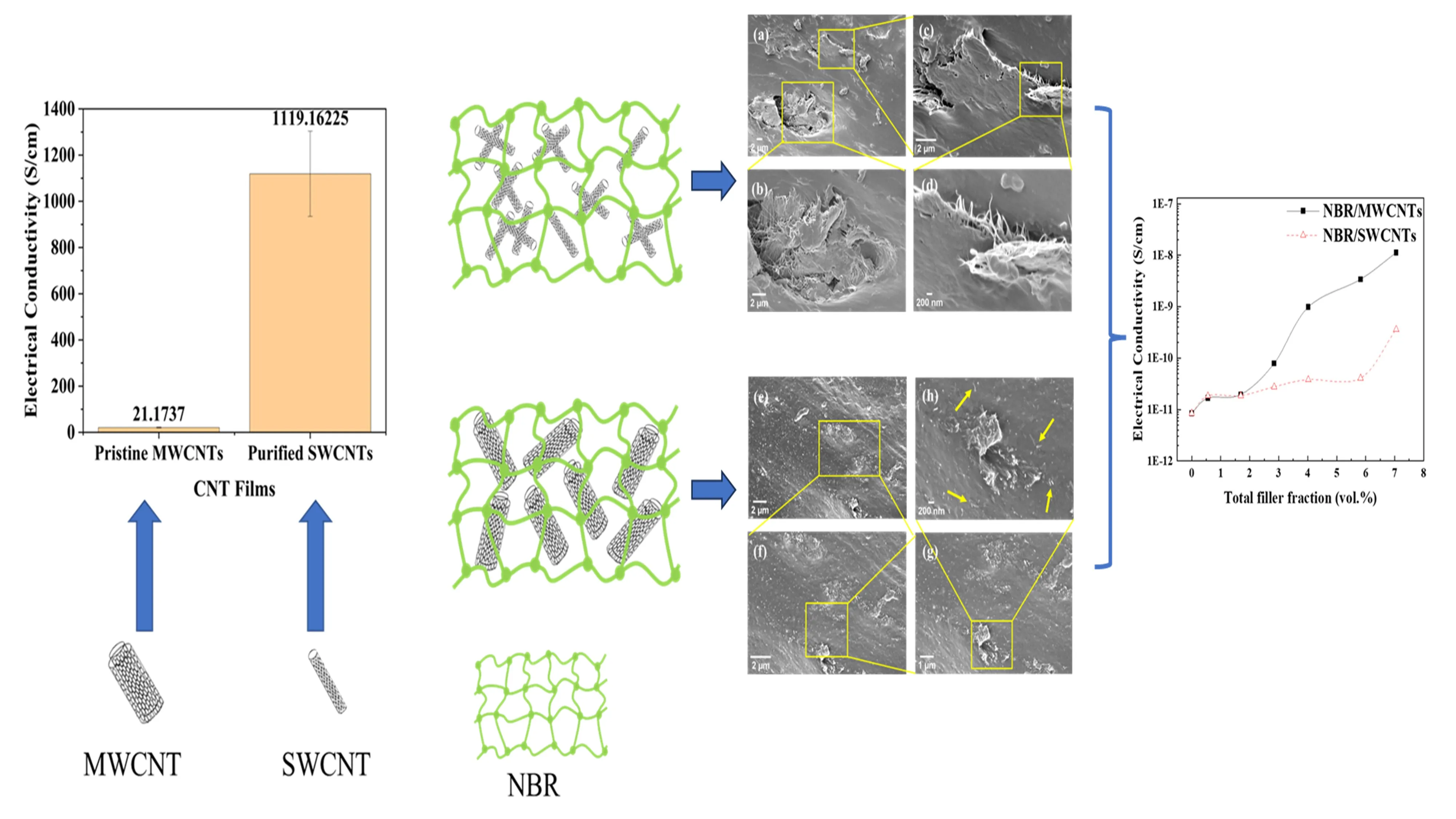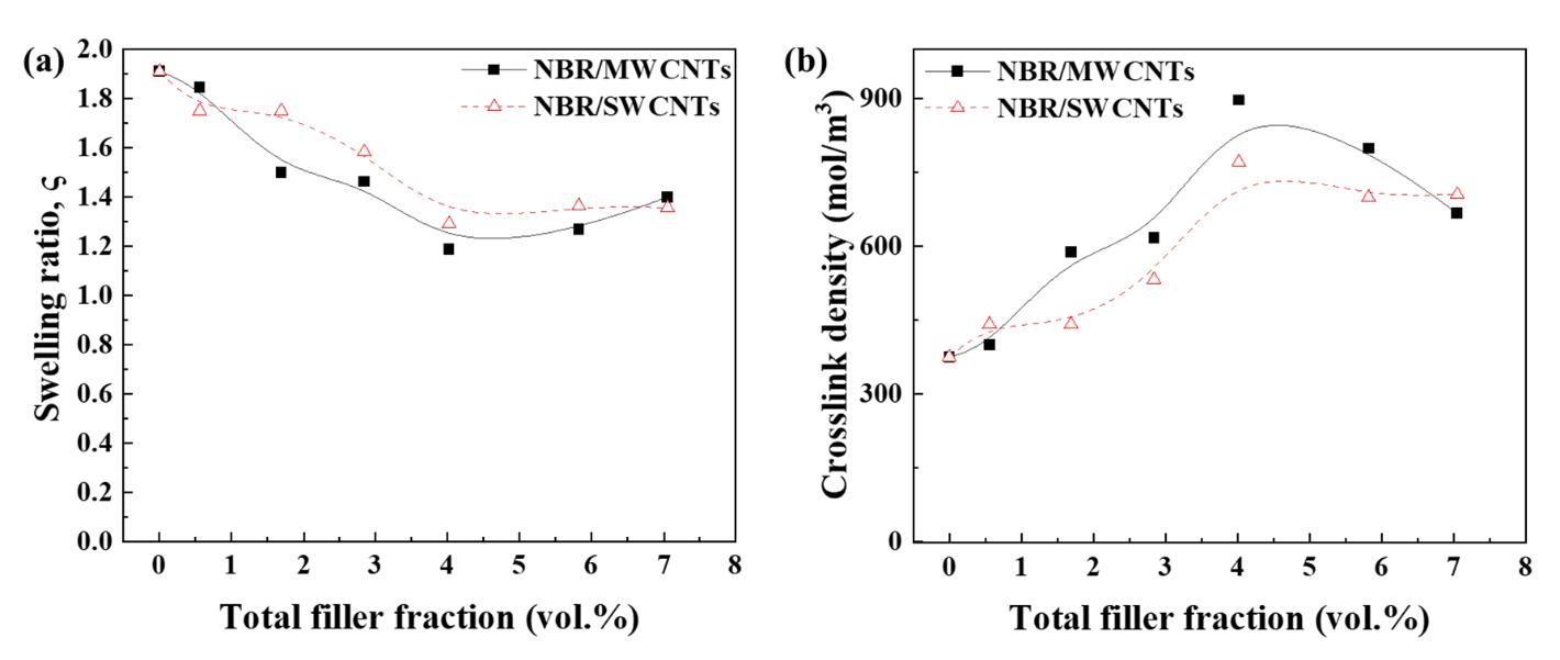The first hypothesis of this study posits that elastomer nanocomposites containing SWCNTs may exhibit enhanced electrical conductivity compared to those filled with MWCNTs, owing to the superior electrical conductivity of SWCNTs.