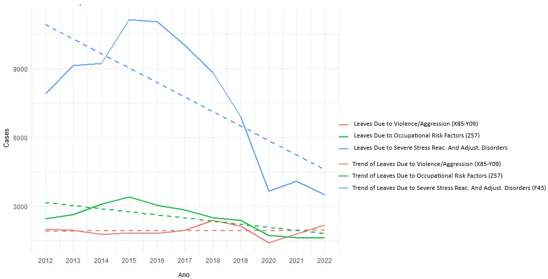 In this context, this study aimed to analyze the relationships between leaves due to occupational stress, classified under ICD F43, and social factors such as unemployment rates, inequality, and workers’ income based on official indicators. Furthermore, it seeks to investigate the interaction between different occurrences of ICD categories, such as exposure.