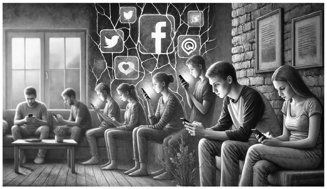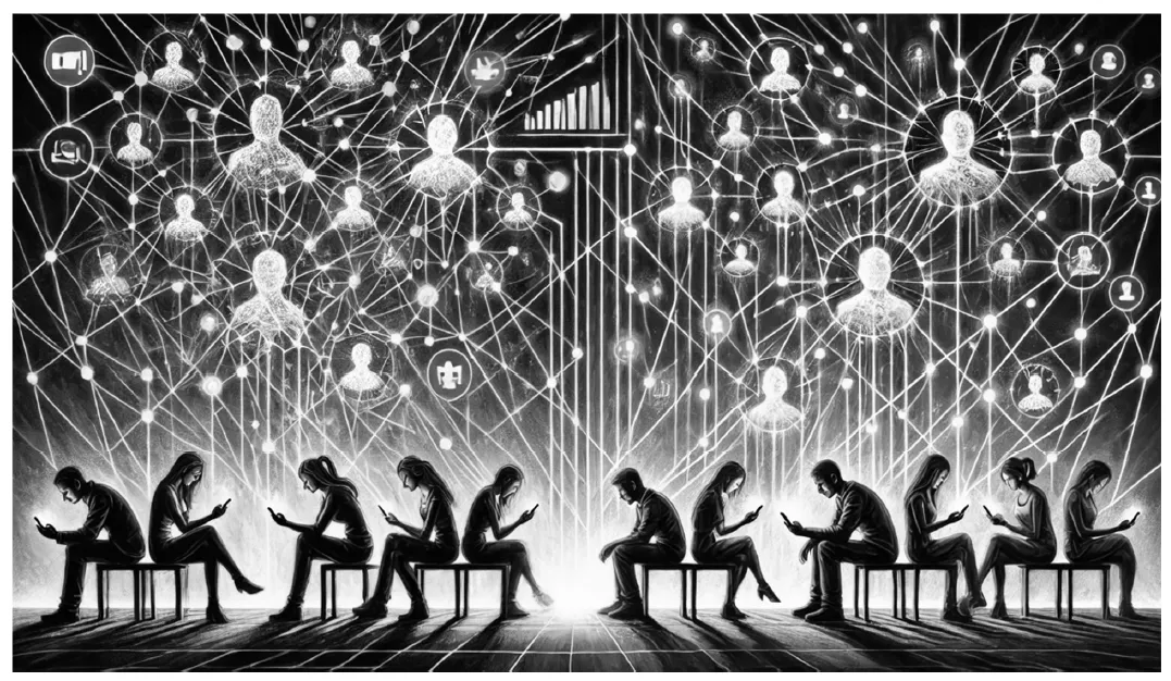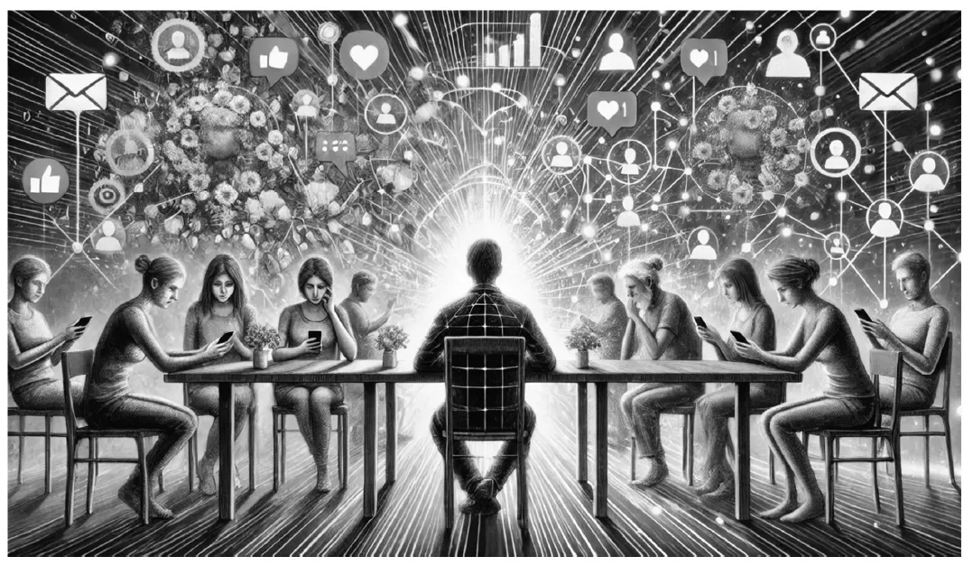 . The Reconfiguration of Friendship and Intimacy in the Digital Age: As online connections multiply, face-to-face emotional bonds weaken, illustrating the tension between quantity and depth in contemporary relationships. This image was created using DALL·E artificial intelligence.