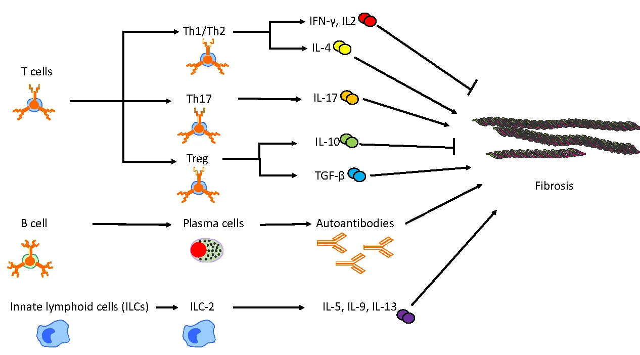 112]. IL-17, a key cytokine produced by Th17 cells, has several functions, including the stimulation of extracellular matrix production, promotion of collagen deposition, and mediation of TGF-β signaling [