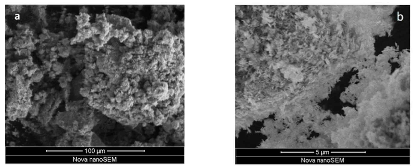 . SEM images of Co<sub>3</sub>O<sub>4</sub>: (<b>a</b>) 100 µm and (<b>b</b>) 5 µm.