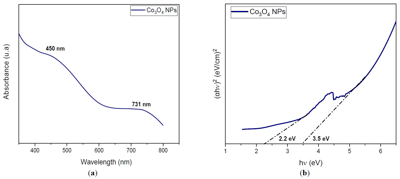 . (<b>a</b>) UV–Visible absorption spectrum of Co<sub>3</sub>O<sub>4</sub>·NPs and (<b>b</b>) Tauc’s plot for Co<sub>3</sub>O<sub>4</sub>·NPs nanoparticles.