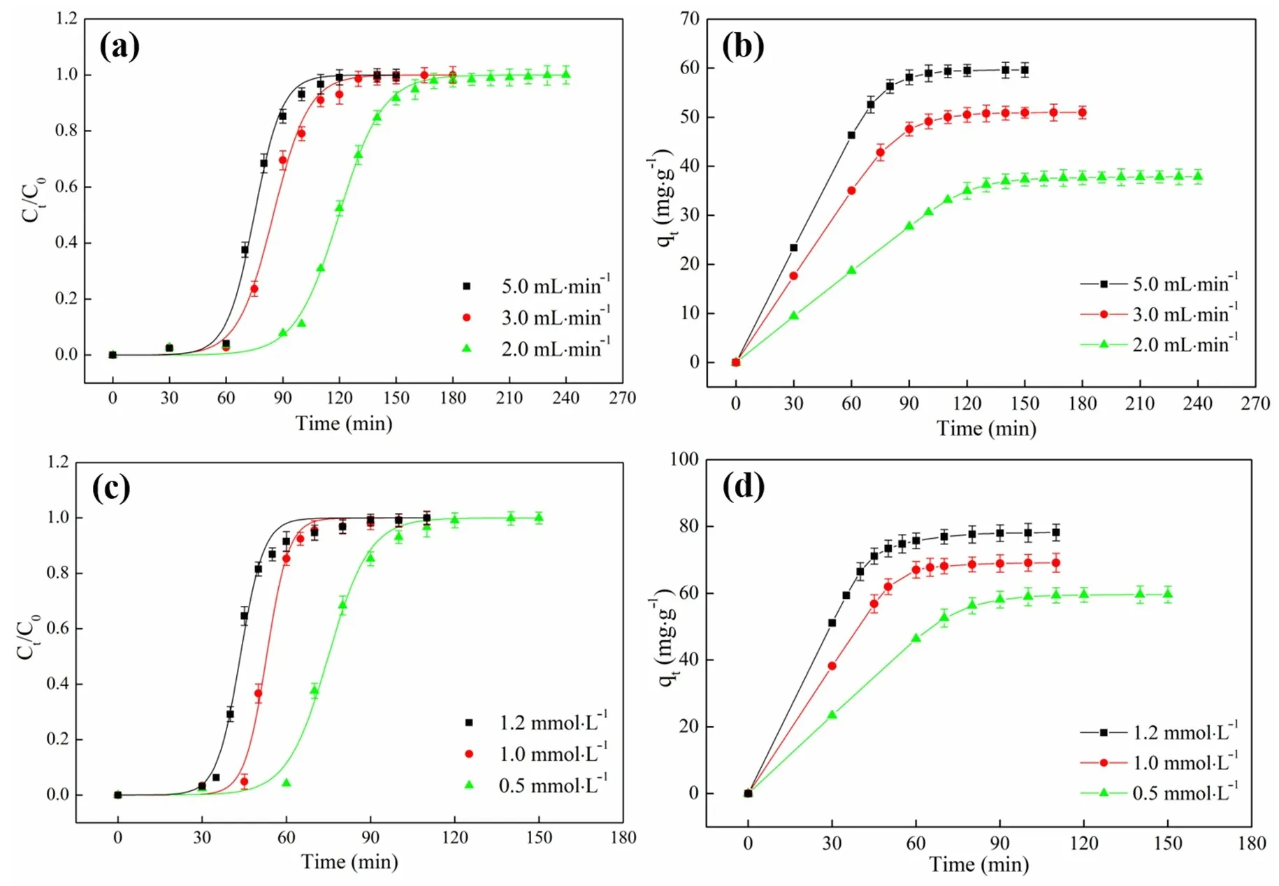C0 < 0.05) and the time to reach adsorption equilibrium decreased as the flow rate and initial concentration increased. For instance, increasing the flow rate from 2.0 mL·min⁻¹ to 3.0 mL·min⁻¹ and then to 5.0 mL·min⁻¹ reduced the breakthrough time from 84.8 min to 58.2 min and further to 53.1 min, while the time to reach saturation reduced from 174.5 min to 129.1 min and then to 109.1 min. Similarly, when the initial concentration increased from 0.5 mmol·L
