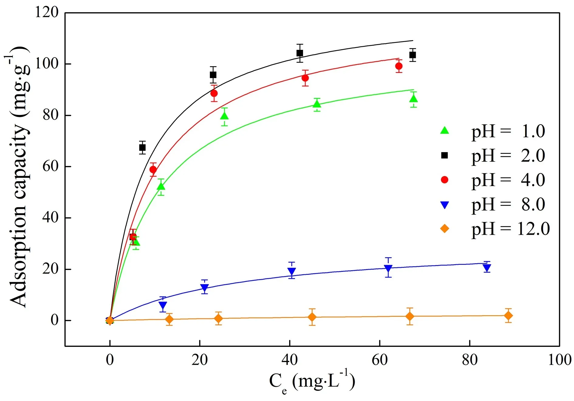 Adsorption experiments were conducted at 25 °C with a shaker set to 250 rpm. To determine the adsorption isotherm, 0.010 g of adsorbent was added to 40.00 mL of glyphosate solution with a concentration range of 10–50 mg·L
