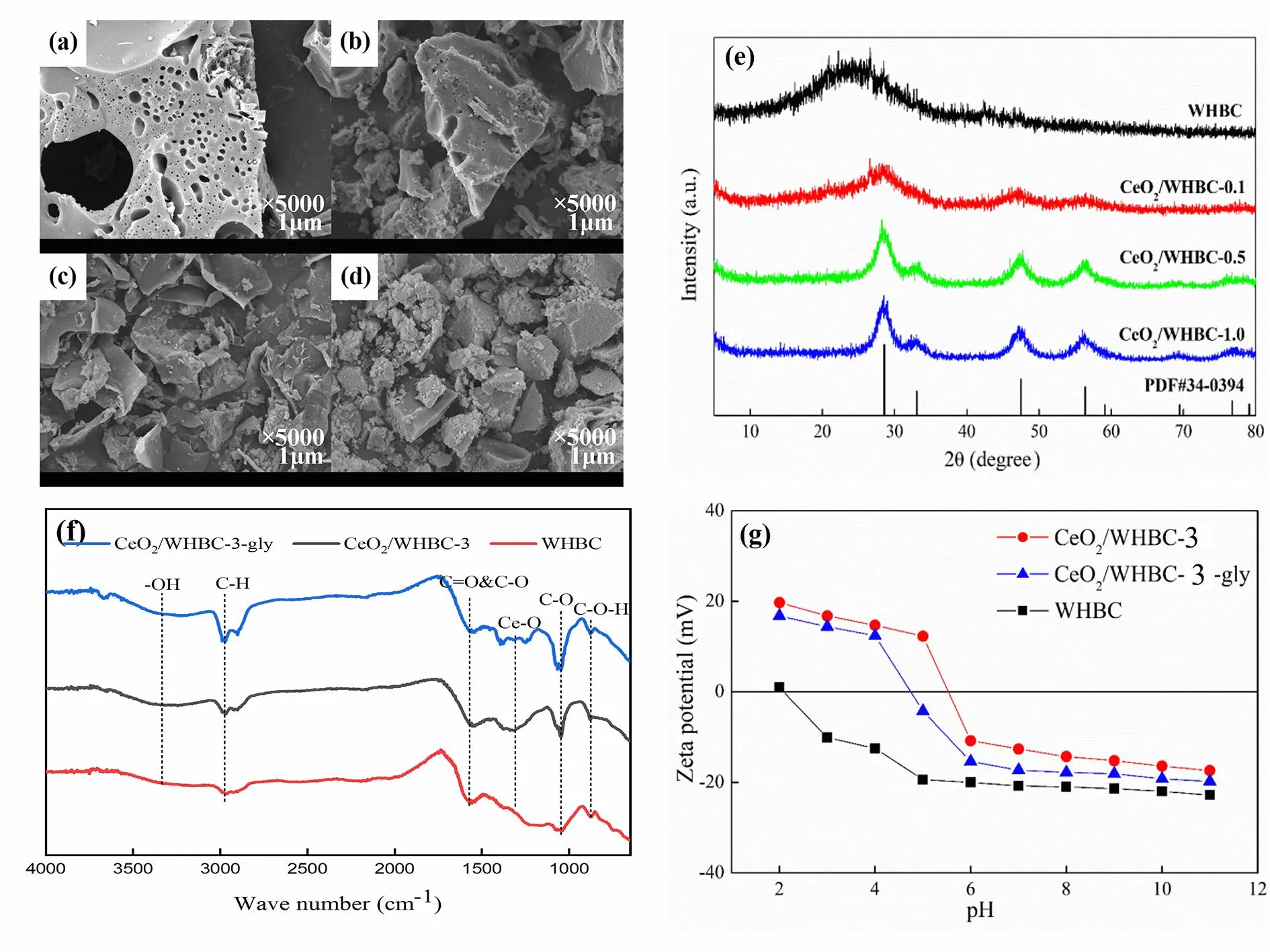 2/WHBC-3 primarily occurs through electrostatic attraction. Additionally, FTIR and XPS characterization of CeO